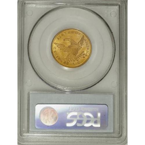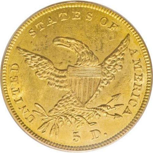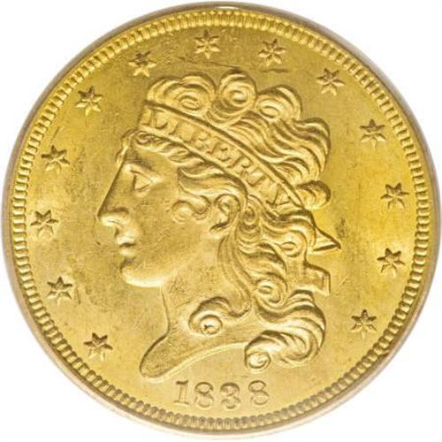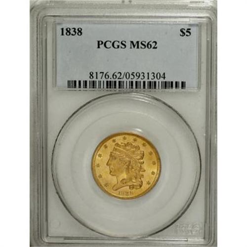 <B>1838 $5 MS62 PCGS.</B></I> Small Arrows, Large 5, Breen-6515, McCloskey 2-B, R.2. A boldly struck final-year Classic half eagle that boasts full luster and orange-gold toning. Generally smooth aside from a thin mark above the portrait and some wispy abrasions near the arrowheads and OF. Population: 13 in 62, 37 finer (8/07).<BR><BR><B>Coin Engraver:</B> William Kneass<BR><BR><b>Shipping:</b> Coins & Currency (<a target="_blank" href="http://www.heritageauctions.com/common/shipping.php">view shipping information</a>)