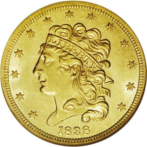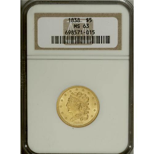 <B>1838 $5 MS63 NGC.</B></I> Small Arrows, Large 5, Breen-6515, McCloskey 2-B, R.2. An intricately struck and refreshingly smooth final-year Classic half eagle. Luster brightens the devices and borders, and the eye appeal is considerable. The Classic type was struck for only five years, and is rare in Select Mint State. Census: 15 in 63, 11 finer (11/06).<BR><BR><b>Shipping:</b> Coin/Currency (<a target="_blank" href="http://www.heritageauctions.com/common/shipping.php">view shipping information</a>)