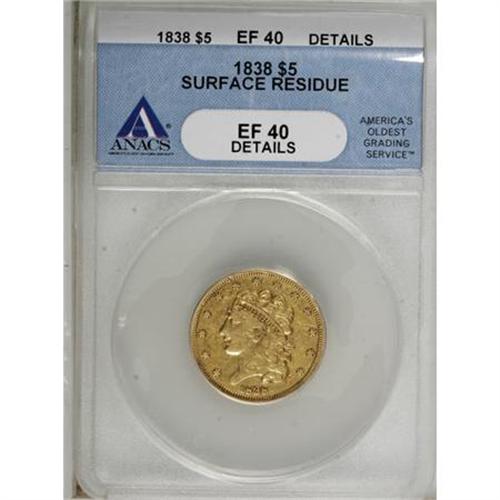<B>1838 $5 --Surface Residue--ANACS</B></I>.<B> XF40 Details.</B></I> NGC Census: (26/454). PCGS Population (36/234). Mintage: 286,588. Numismedia Wsl. Price for NGC/PCGS coin in XF40: $775. (#8176)<BR><BR><B>Coin Engraver:</B> William Kneass<BR><BR><b>Shipping:</b> Coins & Currency (<a target="_blank" href="http://www.heritageauctions.com/common/shipping.php">view shipping information</a>)