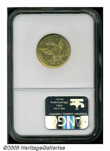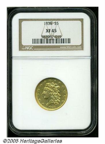 <B>1838<$5> XF45 NGC.</B></I> Breen-6514, Large Arrows, Small 5, McCloskey 1-A, R.2. This bright straw-gold Classic Five has no shortage of remaining luster. An unobtrusive mark on the left (facing) wing and a few faint pinscratches on the upper left obverse are noted.