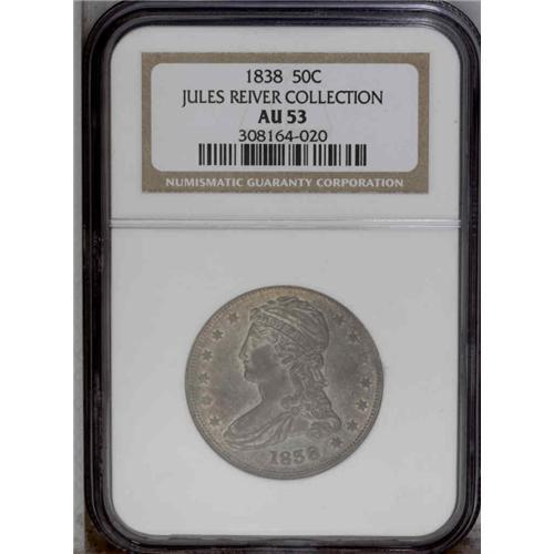 <B>1838<50C> AU53 NGC.</B></I> JR-19. A crack travels from star 3 to the middle of the bust, and another from the rim to the point of the bust, along the bottom of same over the 18 in the date. A mix of gray-blue, gold, and lavender covers both sides. Well defined, except for some of the star centers. The surfaces are relatively clean, and display traces of luster in the protected areas.<BR><I>Ex: Dick Graham.</B></I> Envelope Included.