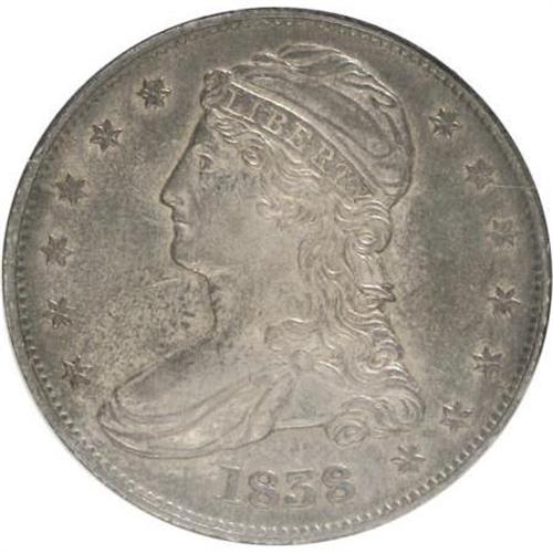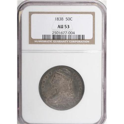 <B>1838 50C AU53 NGC.</B></I> NGC Census: (43/527). PCGS Population (48/381). Mintage: 3,546,000. Numismedia Wsl. Price for NGC/PCGS coin in AU53: $321. (#6177)<BR><BR><B>Coin Engraver:</B> Christian Gobrecht<BR><BR><b>Shipping:</b> Coins & Currency (<a target="_blank" href="http://www.heritageauctions.com/common/shipping.php">view shipping information</a>)