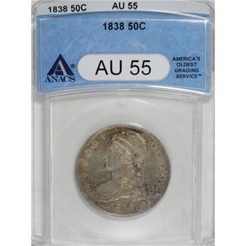 <B>1838 50C AU55 ANACS.</B></I> NGC Census: (100/428). PCGS Population (102/280). Mintage: 3,546,000. Numismedia Wsl. Price for NGC/PCGS coin in AU55: $392. (#6177)<BR><BR><B>Coin Engraver:</B> Christian Gobrecht<BR><BR><b>Shipping:</b> Coins & Currency (<a target="_blank" href="http://www.heritageauctions.com/common/shipping.php">view shipping information</a>)
