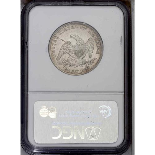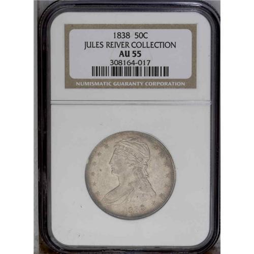 <B>1838<50C> AU55 NGC.</B></I> JR-16d. All reverse cracks are heavy, especially that extending from the D in UNITED to the top of the left wing then down through the shield to between OL of DOL. to the rim. This crack displays several lumps. Considerable luster remains on the silver-gray surfaces tinged with light tan patina around the borders. Sharply impressed, with no serious abrasions.<BR><I>Ex: Heritage (2/1986), lot 2710.</B></I> Envelope Included.