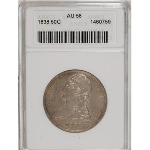 <B>1838 50C AU58 ANACS.</B></I> NGC Census: (178/258). PCGS Population (96/187). Mintage: 3,546,000. Numismedia Wsl. Price for NGC/PCGS coin in AU58: $725. (#6177)<BR><BR><B>Coin Engraver:</B> Christian Gobrecht<BR><BR><b>Shipping:</b> Coins & Currency (<a target="_blank" href="http://www.heritageauctions.com/common/shipping.php">view shipping information</a>)