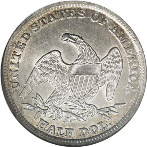 <B>1838<50C> AU58 NGC.</B></I> JR-6a, R.1. A reverse die crack is seen through HAL, along the bottom of UNITED STATES, and up through OF A. Attractively toned with good underlying mint luster and a generally sharp strike. Minor weakness is noted on the obverse denticles and the lower obverse stars. Only a hint of wear is evident on this splendid two-year type coin. Envelope Included.