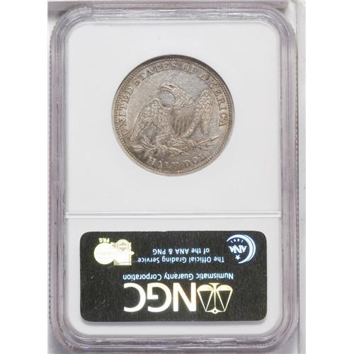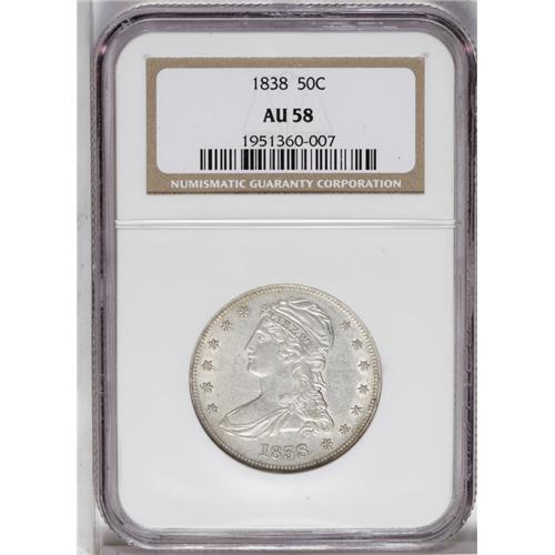 <B>1838<50C> AU58 NGC.</B></I> Traces of circulation exist on the highpoints and faint apricot coloration clings to portions of the peripheries. Large portions of original luster still beam across the surfaces.