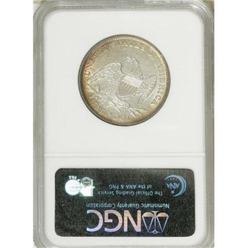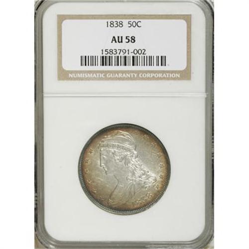 <B>1838 50C AU58 NGC.</B></I> Golden-brown, mauve, and forest-green hug the rims, while the fields and devices are nearly untoned. Satiny, well struck, and lightly abraded.<BR><BR><B>Coin Engraver:</B> Christian Gobrecht<BR><BR><b>Shipping:</b> Coins & Currency (<a target="_blank" href="http://www.heritageauctions.com/common/shipping.php">view shipping information</a>)