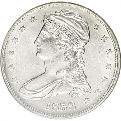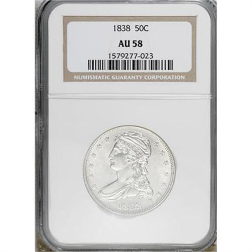 <B>1838 50C AU58 NGC.</B></I> NGC Census: (176/254). PCGS Population (95/185). Mintage: 3,546,000. Numismedia Wsl. Price for NGC/PCGS coin in AU58: $625. (#6177)<BR><BR><B>Coin Engraver:</B> Christian Gobrecht<BR><BR><b>Shipping:</b> Coins & Currency (<a target="_blank" href="http://www.heritageauctions.com/common/shipping.php">view shipping information</a>)