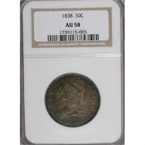 <B>1838 50C AU58 NGC.</B></I> NGC Census: (174/254). PCGS Population (95/185). Mintage: 3,546,000. Numismedia Wsl. Price for NGC/PCGS coin in AU58: $625. (#6177)<BR><BR><B>Coin Engraver:</B> Christian Gobrecht<BR><BR><b>Shipping:</b> Coins & Currency (<a target="_blank" href="http://www.heritageauctions.com/common/shipping.php">view shipping information</a>)