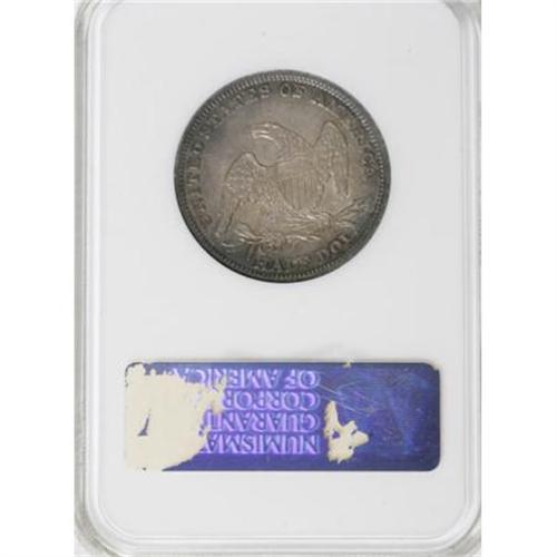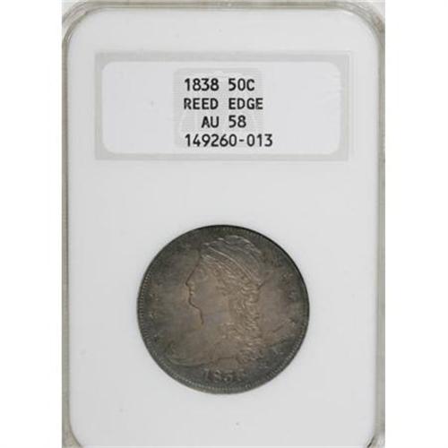 <B>1838 50C AU58 NGC.</B></I> Excellent central definition, though the stars show slight softness. This richly toned piece, dusky green and violet-blue with hints of subtle orange, has subtle luster beneath the patina and just a touch of highpoint friction.<BR><BR><B>Coin Engraver:</B> Christian Gobrecht<BR><BR><b>Shipping:</b> Coins & Currency (<a target="_blank" href="http://www.heritageauctions.com/common/shipping.php">view shipping information</a>)