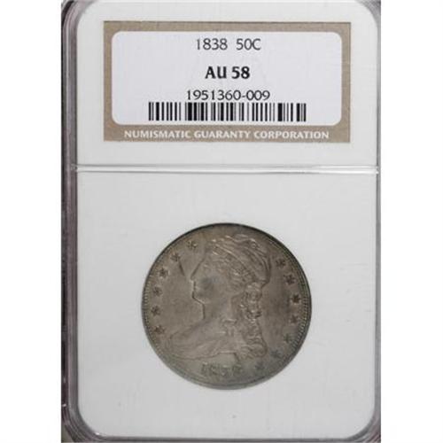 <B>1838 50C AU58 NGC.</B></I> An impressive strike leaves sharp definition on the design elements of this light to medium gray near-Mint half. Both sides are relatively clean, save for a light grease streak extending from the lower right part of star 5.<BR><BR><B>Coin Engraver:</B> Christian Gobrecht<BR><BR><b>Shipping:</b> Coins & Currency (<a target="_blank" href="http://www.heritageauctions.com/common/shipping.php">view shipping information</a>)