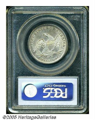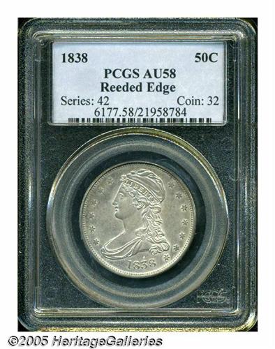 <B>1838<50C> AU58 PCGS.</B></I> This is a lovely example with frosty silver luster beneath dove-gray toning on the obverse. The reverse is almost fully brilliant with wisps of champagne toning.