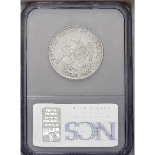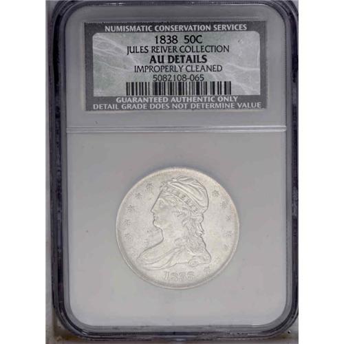 <B>1838<50C>--Improperly Cleaned--NCS. AU Details.</B></I> JR-10, R.7. A fine crack is seen from the field through the ball and the top of the cap, and from the rim to the leaf point left of H in HALF, up to the shield where it runs through the lower third to the left wing. Silver-gray surfaces display wispy hairlines, and traces of luster in the protected areas. Sharp design definition throughout.<BR><I>Ex: Padgett (1/1986)</B></I> Envelope Included.