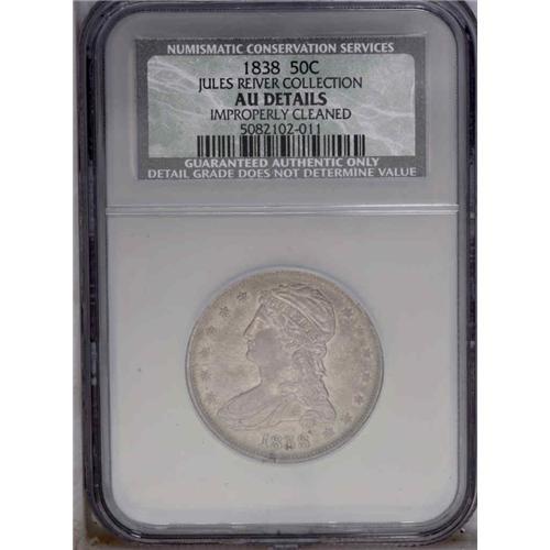 <B>1838<50C>--Improperly Cleaned--NCS. AU Details.</B></I> JR-3b, R.2. A fine crack is visible from bust point up to dentils left of bottom of star 1, another connects the bottoms of 1838, and another from the bottom of the curl through star 12 to dentils near star 11. A fine cracks connects tops of AMERIC. Medium gray surfaces are finely hairlined, and a small scratch extends from the C in AMERICA into the left wing.<I>Ex: Heritage (1/1986), lot 2709.</B></I> Envelope Included.