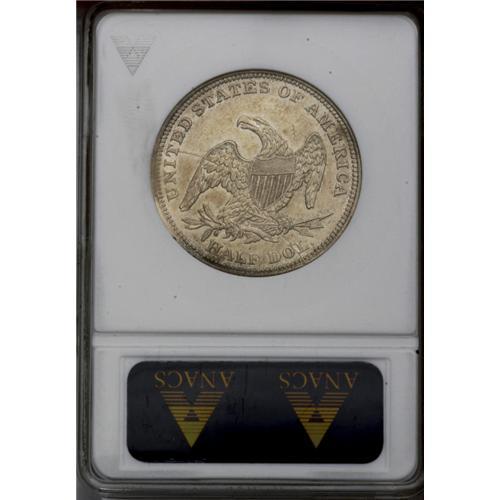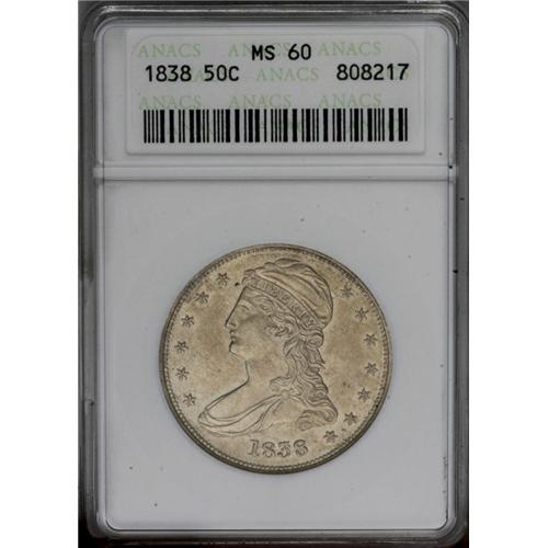 <B>1838<50C> MS60 ANACS.</B></I> Unusually well struck for a Reeded Edge half dollar, and the light pearl-gray toning is attractive. Relatively unmarked for the basal Mint State level. Both sides display lengthy, slender die cracks. <BR><BR><B>Important notice:</B> Heritage usually auctions material at the rate of 200-250 lots per hour. On some occasions eBay Live bid software or the Internet may not be able to keep up with the pace of the auction. We recommend placing a realistic absentee bid now as insurance to avoid disappointment. Occasionally the auctioneer may eliminate or reject an eBay Live bid, and the auctioneer may also reopen a lot after the close of the eBay live bidding (usually because we missed an audience bid), and may reject your bid even if it shows you as the winning bidder. By bidding via eBay Live, you agree that Heritage may award the lot to another bidder at its sole discretion under the circumstances described above or any other reasonable circumstances. Since eBay bids are not shown to us until we open the lot on the floor, we treat those bids just like floor bids. In most cases the floor responds before the eBay bid is presented to us, due to Internet lag time, so for consistency we have made it a policy that floor bids are always considered first over tie eBay live bids. Also please note that all Heritage lots purchased through eBay Live carry a 20% Buyer's Premium. Please make sure you read the Terms and Conditions before you bid. This lot is being auctioned in conjunction with a live floor auction by Heritage Galleries & Auctioneers. All final auction and invoice information will be supplied by Heritage Galleries & Auctioneers, and all other information should be considered preliminary. Lot:1979 <BR><BR><B>Winning Notification and Billing:</B> After the FINAL session in this auction is complete, Heritage will send e-mail and snail mail invoices. This process normally takes several days. All final auction and invoice information will be supplied by Heritage Galleries & Auctioneers, and all other information should be considered preliminary. <BR><BR>This auction will be conducted on a live auction floor and over the Internet through eBay Live. If you choose to place an absentee bid, please take a moment to <font color='#0000ff'><u><a href='http://pages.ebay.com/liveauctions/help/before/laabsentee.html'>learn how eBay Live absentee bidding works</a></u></font><font color='#000000'>