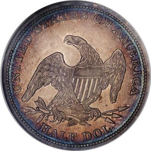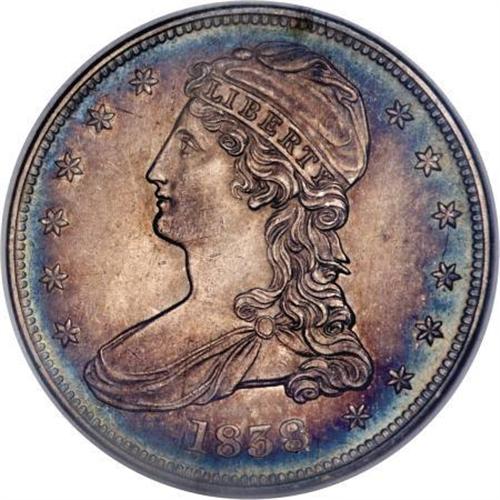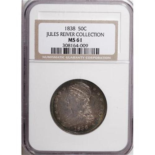 <B>1838 50C MS61 NGC.</B></I> Ex: Jules Reiver Collection. JR-12, R.3. A crack extends from the rim through the first T of STATES through the eagle's beaks to the neck. Another goes from right of the eye to bisect the shield before reaching the rim between the F and D of HALF DOL. Peripheral electric-blue around the peripheries grades into lavender and golden-brown toward the centers. A few light abrasions are seen on Liberty's cheek and neck.<BR><I>Ex: George Ramont; Jules Reiver Collection (Heritage, 1/06), lot 23425.</B></I><BR><BR><B>Coin Engraver:</B> Christian Gobrecht<BR><BR><b>Shipping:</b> Coins & Currency (<a target="_blank" href="http://www.heritageauctions.com/common/shipping.php">view shipping information</a>)