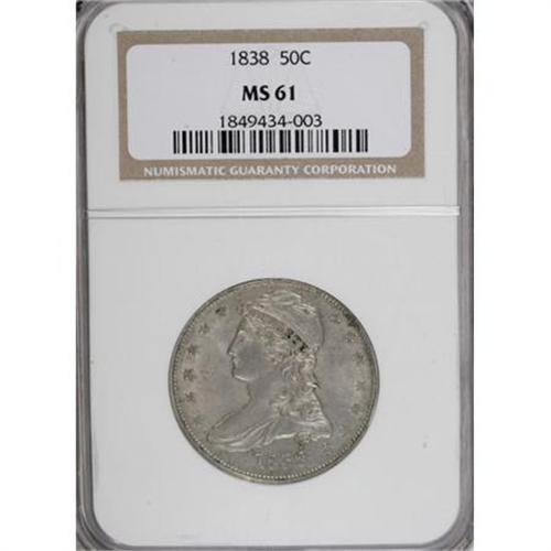 <B>1838 50C MS61 NGC.</B></I> NGC Census: (42/207). PCGS Population (23/152). Mintage: 3,546,000. Numismedia Wsl. Price for NGC/PCGS coin in MS61: $875. (#6177)<BR><BR><B>Coin Engraver:</B> Christian Gobrecht<BR><BR><b>Shipping:</b> Coins & Currency (<a target="_blank" href="http://www.heritageauctions.com/common/shipping.php">view shipping information</a>)
