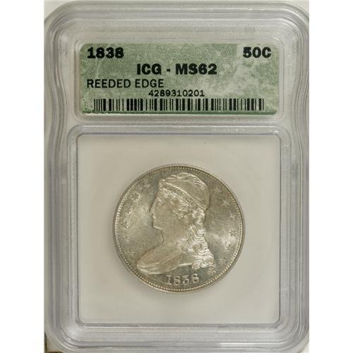 1838 50C MS62 ICG. This lustrous bust half has medium