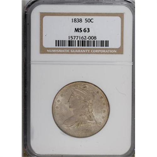 <B>1838 50C MS63 NGC.</B></I> An outstanding Select example of this Reeded Edge issue, part of a two-year type with the Bust obverse and the denomination given as HALF DOL. This well struck and luminous piece exhibits warm rose and orange patina over much of each side.<BR><BR><B>Coin Engraver:</B> Christian Gobrecht<BR><BR><b>Shipping:</b> Coins & Currency (<a target="_blank" href="http://www.heritageauctions.com/common/shipping.php">view shipping information</a>)