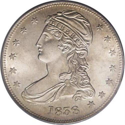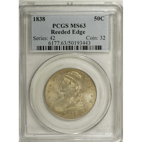 <B>1838 50C MS63 PCGS.</B></I> Stars 10 and 11 are noticeably recut. The highly lustrous surfaces display a pleasing satiny radiance and attractive light coloration, with pale greenish-gray and golden tinges. Shallow luster grazes and a few tiny blemishes are noted on the left obverse field and along Liberty's jawline.<BR><I>From The Rocky Top Collection of Bust Half Dollars.</B></I><BR><BR><b>Shipping:</b> Coins & Currency (<a target="_blank" href="http://www.heritageauctions.com/common/shipping.php">view shipping information</a>)