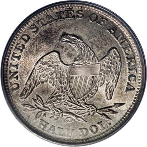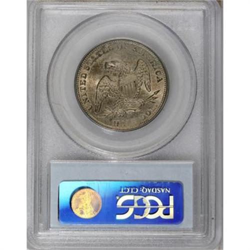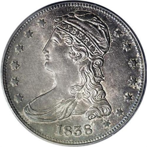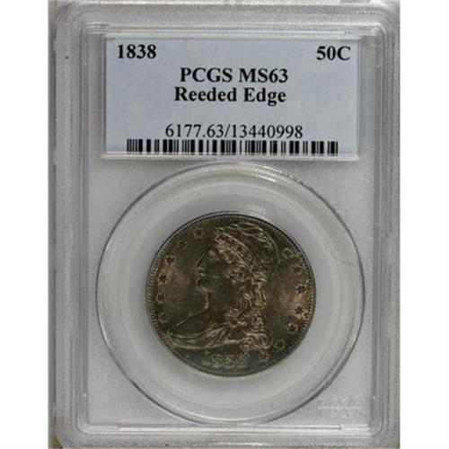 <B>1838 50C Reeded Edge MS63 PCGS.</B></I> Rich sea-green and tan toning envelop this satiny and lightly abraded type coin. The centers are precisely struck, while the borders show minor incompleteness. The HALF DOL. reverse and the Capped Bust obverse were combined only for 1838 and 1839. Population: 54 in 63, 42 finer (7/07).<BR><BR><B>Coin Engraver:</B> Christian Gobrecht<BR><BR><b>Shipping:</b> Coins & Currency (<a target="_blank" href="http://www.heritageauctions.com/common/shipping.php">view shipping information</a>)