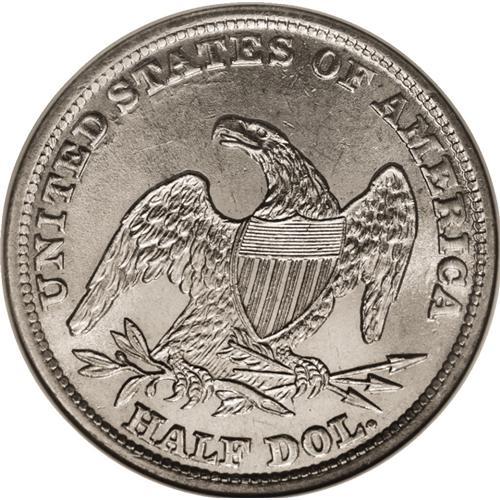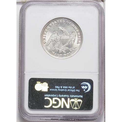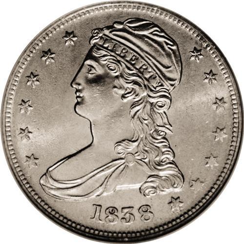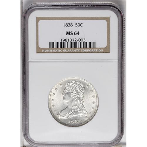 <B>1838<50C> MS64 NGC.</B></I> The extremely lustrous surfaces are a light silver-blue, with glimpses of gold. A miscellany of light abrasions is seen on Liberty's cheek, and there are numerous parallel striations noted in the planchet, apparent remnants of the drawing bench that was used to reduce planchet stock to its exact thickness required before coinage. This lovely near-Gem example would be well suited to a high grade type set. Population: 29 in 64, 8 finer (8/06).