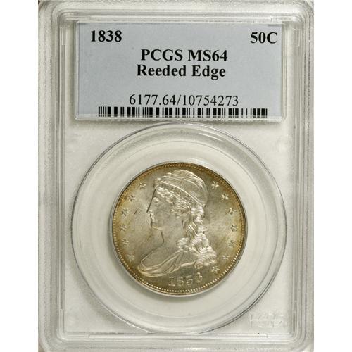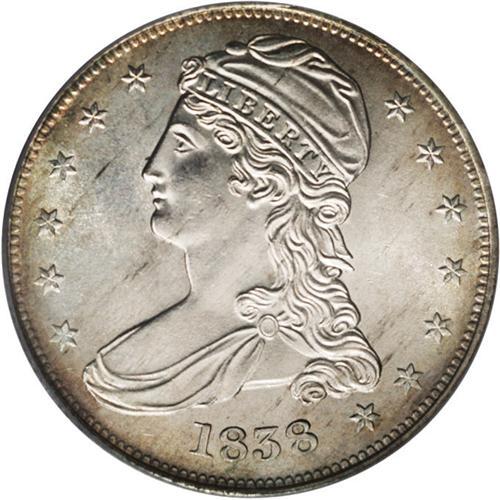 <B>1838 50C MS64 PCGS.</B></I> A beautiful example of this elusive type coin. Fewer than 100 near-Gem examples have been certified by PCGS and NGC, and only about 30 specimens finer. Whispers of gold-tan color hug the marginal areas, leaving the centers essentially untoned. The design features are well brought up; only the first star reveals minor softness on the centrils. The surfaces exhibit nice luster and are well preserved. Were it not for a couple of minor marks on Liberty's cheek, this marvelous coin would grade even higher. Population: 29 in 64, 8 finer (1/07).<BR><BR><b>Shipping:</b> Coins & Currency (<a target="_blank" href="http://www.heritageauctions.com/common/shipping.php">view shipping information</a>)