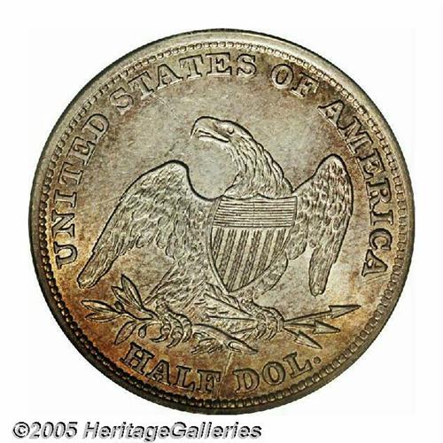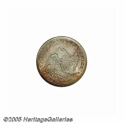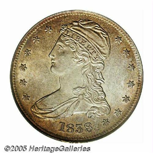 <B>1838<50C> MS64 PCGS.</B></I> JR-12, R.4. A very Choice coin that shows creamy luster in the fields and is bathed in pleasing orange-gold toning. Struck on the new steam coining press at the Philadelphia Mint, which produced sharp strikes on these early half dollars. This coin is no exception, with the curls on Liberty and all the eagle's proud feathers full and complete. Examination of the reverse will note a complex die crack, one extending down through the first T of STATES to the eagle's beak, and another up from the rim near the F of OF to through the branch, shield, neck, just behind the eagle's eye to the E of STATES. A great coin for the specialist or type collector.