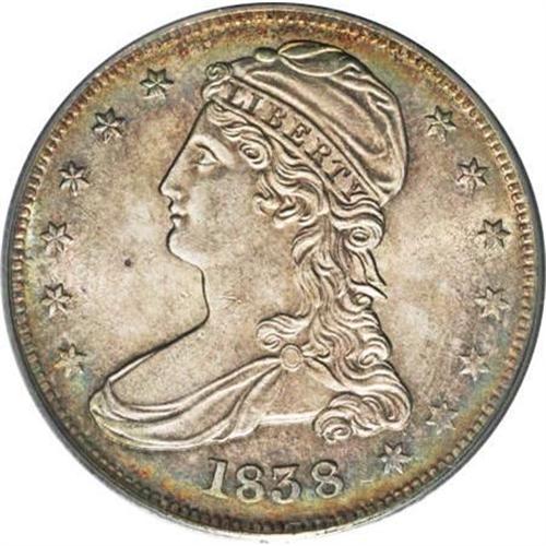<B>1838 50C MS64 PCGS.</B></I> A lovely example from this historic year that saw the opening of the nation's first branch mint in Louisiana, Georgia, and North Carolina, and the production of the 1838-O proof half dollars. This more affordable 1838-P boasts splendid peripheral toning in jade and saffron, with grayish centers and tons of eye appeal. Population: 35 in 64, 8 finer (3/08).<BR><BR><B>Coin Engraver:</B> Christian Gobrecht<BR><BR><b>Shipping:</b> Coins & Currency (<a target="_blank" href="http://www.heritageauctions.com/common/shipping.php">view shipping information</a>)