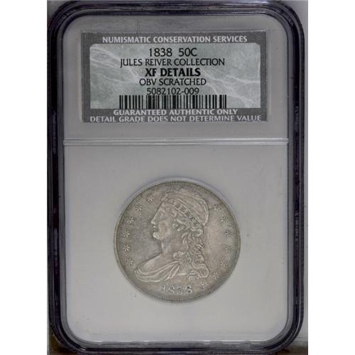 <B>1838<50C>--Obverse Scratched--NCS. XF Details.</B></I> JR-1, R.8. A crack runs from the rim just below star 6 to the top of the eye through the hair and T of LIBERTY and star 7 to the rim. A reverse crack extends from the rim through the T of UNITED into the right wing. A diagonal crack occurs in the center left (facing) part of the shield. Another runs from the rim between the OL of DOL. into the arrow feathers. The surfaces are a golden-gray color, and display several parallel scratches in the right (facing) obverse field.<BR><I>Ex: Padget (4/1988).</B></I> Envelope Included.