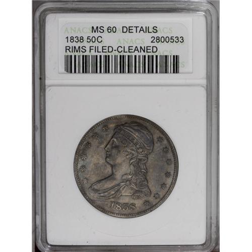 1838 50C --Rims Filed, Cleaned--ANACS. MS60 Details. Th 1838[50C]--Rims Filed, Cleaned--ANACS. MS60