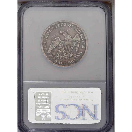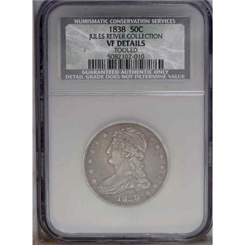 <B>1838<50C>--Tooled--NCS. VF Details.</B></I> JR-2e, R.5. this advanced die state shows a crack from the N of UNITED through the field to the eagle's head, then along the left side of the first A in AMERICA to the rim. A few minute marks are scattered over the light to medium gray surfaces, and parts of the right field behind the head have apparently been smoothed.<BR><I>Ex: Conroy (4/1990).</B></I> Envelope Included.