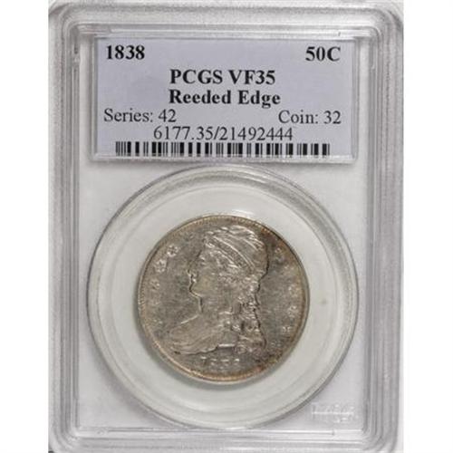 <B>1838 50C VF35 PCGS.</B></I> PCGS Population (19/640). NGC Census: (12/674). Mintage: 3,546,000. Numismedia Wsl. Price for NGC/PCGS coin in VF35: $109. (#6177)<BR><BR><B>Coin Engraver:</B> Christian Gobrecht<BR><BR><b>Shipping:</b> Coins & Currency (<a target="_blank" href="http://www.heritageauctions.com/common/shipping.php">view shipping information</a>)