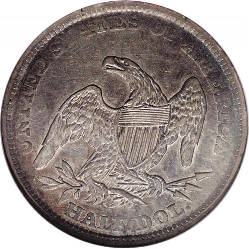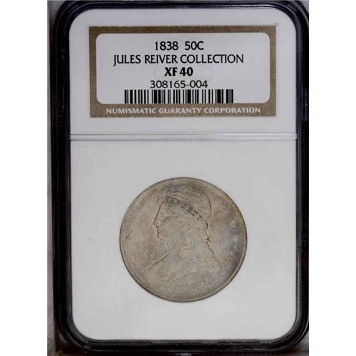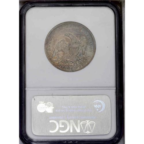 <B>1838<50C> XF40 NGC.</B></I> JR-21. A diagonal crack bisects the reverse from the shaft above the left (right facing) claw, through the shield and upper part of the right (left facing) wing, to the right of the first S in STATES to the rim. The surfaces display a mix of orange, gray, lavender, and light blue toning. Roller marks are visible in the upper left (facing) obverse field.<BR><I>Ex: Dick Graham (4/1997).</B></I> Envelope Included.