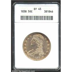 1838 50C XF45 ANACS. The golden-gray patina deepens slightly to orange-gold hues toward the borders. The wear is light, even, and confined to the highest points of the design, and considerable original luster remains.From the Ohio Collection.  Important notice: We expect to be auctioning lots at the rate of 200-250 per hour. Sometimes eBay Premier live bid software cannot keep up with that pace, so we strongly recommend that you place a realistic proxy bid now as insurance to avoid disappointment. Also please note that all Heritage/CAA lots purchased through eBay Premier carry a 20% Buyer's Premium.