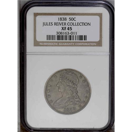 <B>1838<50C> XF45 NGC.</B></I> JR-2f, R.5. In this late die state, the crack from the N in UNITED through the I then to the beak and on to the rim via the left side of the first A in AMERICA becomes heavier with larger lumps. Also, the reverse field levels are different along a crack that has developed from the rim through the R in AMERICA and across the left wing. the surfaces portray a melange of gray, blue, and orange-beige coloration. A couple of short, shallow cuts in the lower right field and through star 11 are mentioned for accuracy.<BR><I>Ex: Jonathan Kern (11/1995).</B></I> Envelope Included.