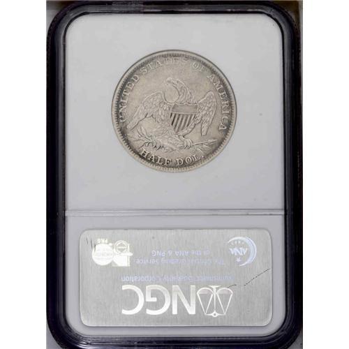 <B>1838<50C> XF45 NGC.</B></I> JR-7a, R.6. An obverse rim break occurs between star 13 and the date. On the reverse, a peripheral die crack extends from the left side of M in AMERICA to the left side of L in HALF. This piece shows pleasing medium-gray toning on both sides, with darker sea-green color near the peripheries. Typically worn for the grade, with a few noticeable abrasions on each side. Envelope Included.