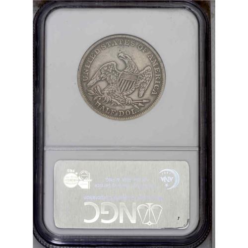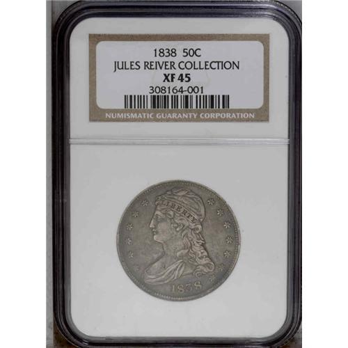 <B>1838<50C> XF45 NGC.</B></I> JR-7b, R.6. A heavy rim break flattens most of the dentils between obverse star 13 and the second 8 in the date. On the reverse, an unusually heavy peripheral die crack extends from the left side of L in HALF to the left side of the first A in AMERICA, traveling mainly along the bottoms of the intervening letters. Deeply toned on both sides, with a few scattered pinscratches and typical highpoint wear. Envelope Included.