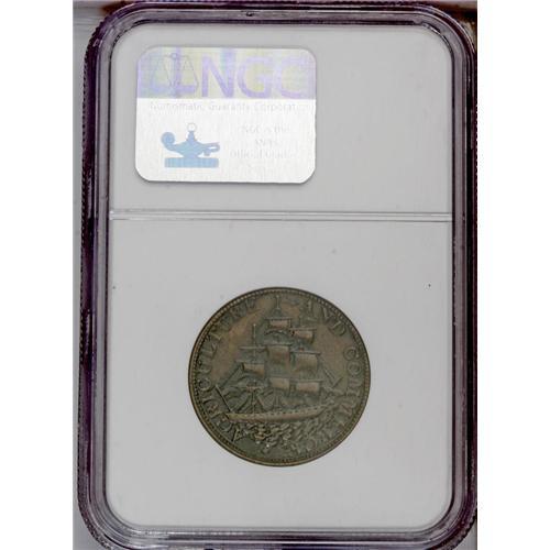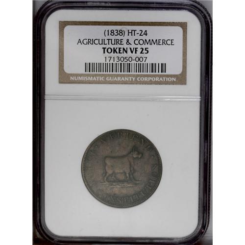 <B>1838 Agriculture and Commerce, Low-66, Rulau-HT-24, DeWitt-CE-1838-18, R.3, VF25 NGC.</B></I> Copper. Moderately worn with dark patina over both sides. A nice mid-grade example. This token with the ship obverse and the cow reverse was engraved by Gibbs and is quite scarce.<BR><I>From The Troy Wiseman Collection.</B></I>