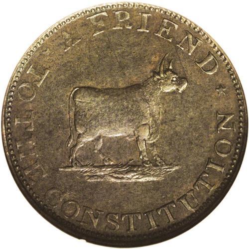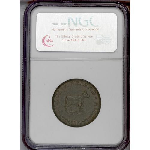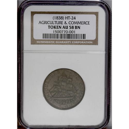 <B>1838 Agriculture and Commerce, Low-66, Rulau-HT-24, DeWitt-CE-1838-18, R.3, AU58 NGC.</B></I> Copper. A reasonably well struck example of this Hard Times token, with deep tan and charcoal-brown coloration, slight highpoint wear, and surfaces that are generally abrasion-free except for a couple of small marks on the cow.<BR><I>From The Troy Wiseman Collection.</B></I>