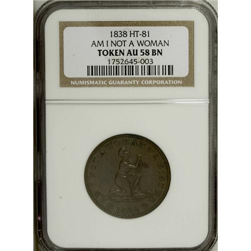 <B>1838 Am I Not a Woman AU58 NGC.</B></I> Low-54, HT-81. A charming mahogany-brown representative that has an inconspicuous spot within the A in WOMAN. Nicely struck save for the date and ribbon.<BR><BR><b>Shipping:</b> Coin/Currency (<a target="_blank" href="http://www.heritageauctions.com/common/shipping.php">view shipping information</a>)