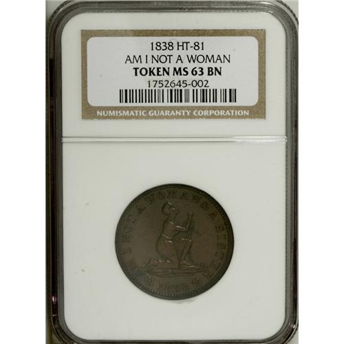 <B>1838 Am I Not a Woman MS63 Brown NGC.</B></I> Low-54, HT-81. A mildly reflective token with unblemished golden-brown surfaces. Minor carbon is detected near the rims. Low-54 is plentiful, but its masculine counterpart, Low-54A, is extremely rare.<BR><BR><b>Shipping:</b> Coin/Currency (<a target="_blank" href="http://www.heritageauctions.com/common/shipping.php">view shipping information</a>)