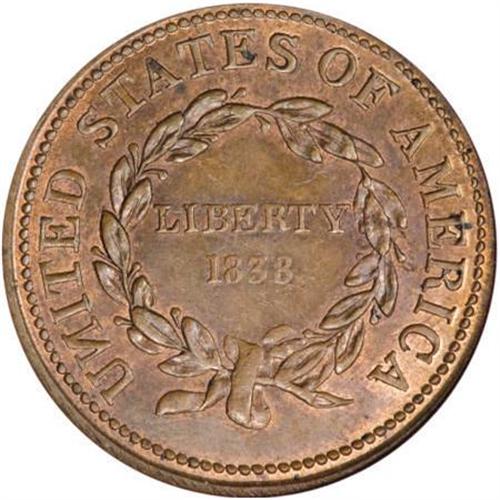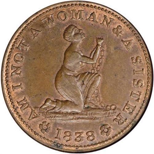 <B>1838 Am I Not a Woman & a Sister, HT-81, MS62 Red and Brown NGC.</B></I> Low-54, R.1. This abolitionist token sympathetically presents a woman in chains, pleading for the relief of her suffering. Crisply struck aside from the 8 in the date, and only a few minute marks are present. Generous portions of brick red cling to the wreath and legends.<BR><I>From The Madison Collection.</B></I><BR><BR><b>Shipping:</b> Coins & Currency (<a target="_blank" href="http://www.heritageauctions.com/common/shipping.php">view shipping information</a>)