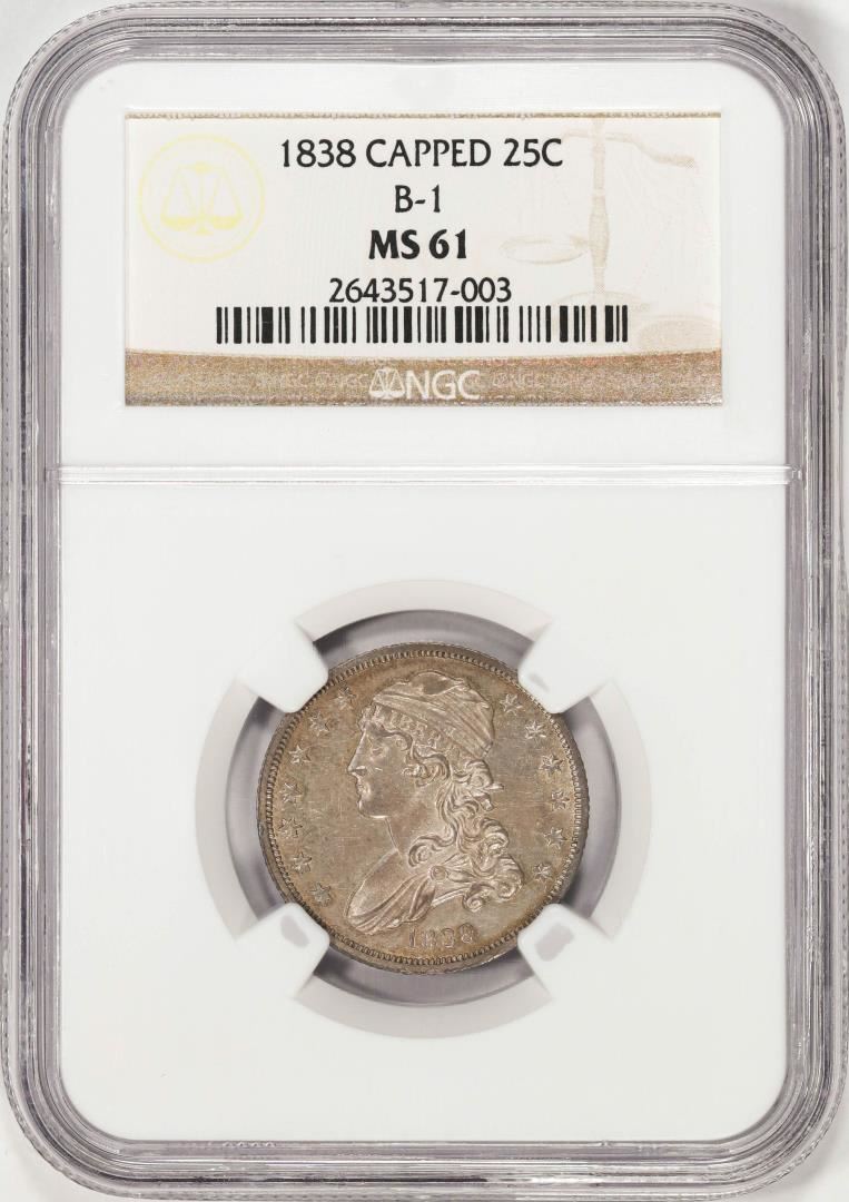 One 1838 B-1 Capped Bust Quarter Coin NGC MS61. NGC Certified.