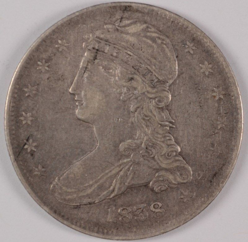 1838 BUST HALF DOLLAR, REEDED EDGE, XF+ NICE