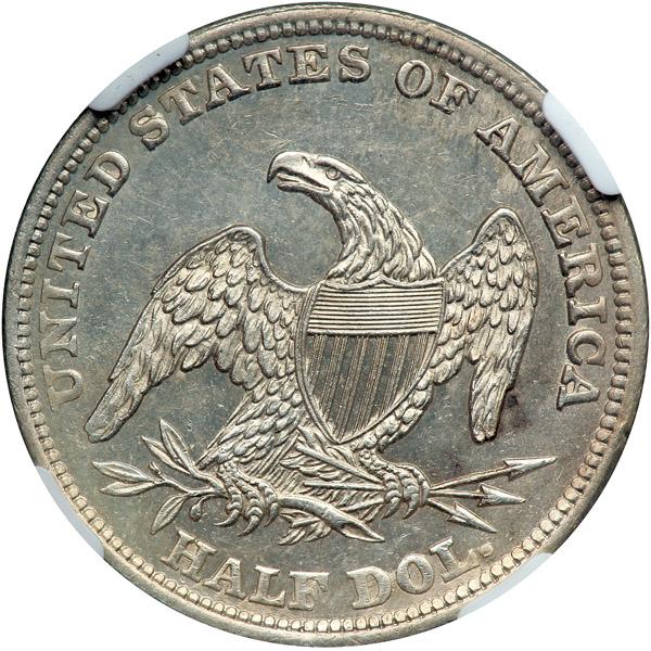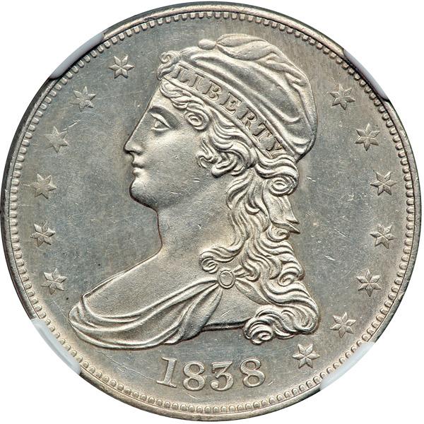 1838 Capped Bust Half Dollar. NGC graded MS-62. Well struck, untoned with a slight degree of reflectivity. There are several aspects that go into making up the grade of any given coin. Strike, luster, surface quality, toning. And on any given coin there is one element that immediately captures the viewer's attention more than any other. On this Mint State piece it is the smooth surfaces. Delicate and satin-to-prooflike, it is almost easy to ignore the fullness of strike at Liberty and the eagle, or the almost mark-free surfaces that also go into the makeup of the grade.