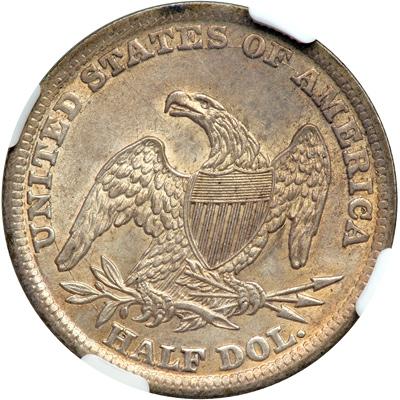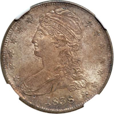 1838 Capped Bust Half Dollar. NGC graded MS-64. Lustrous frosty silvery gray surfaces with rich colorful highlights. Full cap and hair curls and other head details on Liberty (notice the sharp detail on the clasp at her shoulder). Similarly on the reverse, where this coin received a complete blow by the die. A truly choice borderline-gem specimen of a short-lived Type from our formative years as a growing nation. Pop 68; 23 finer, 17 in 65, 5 in 66, 1 in 67.