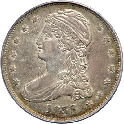1838 Capped Bust Half Dollar. PCGS graded EF-45. Nicely toned with original shades of neutral "old silver" interspersed with some russet gold around the edge. A two-year Type (1838-39) (PCGS # 6177) .