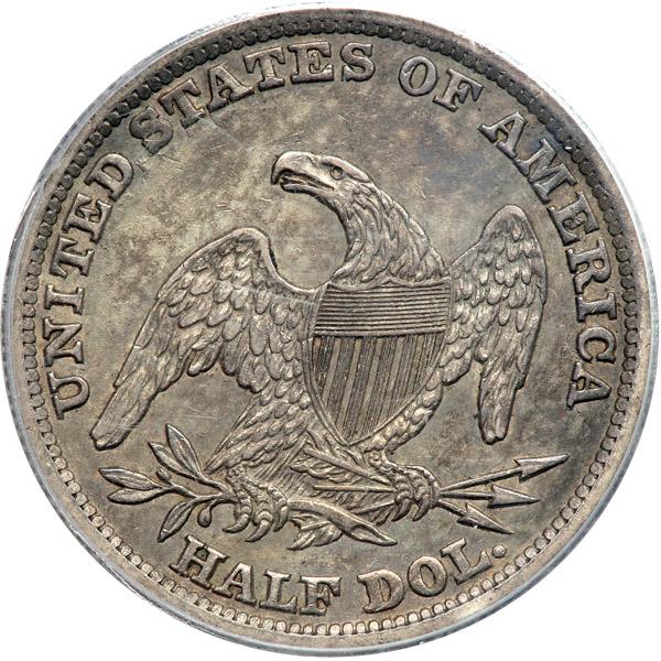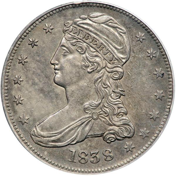 1838 Capped Bust Half Dollar. PCGS graded AU-50. A nice sharp strike with natural antique toning on both sides (PCGS # 6177) .
